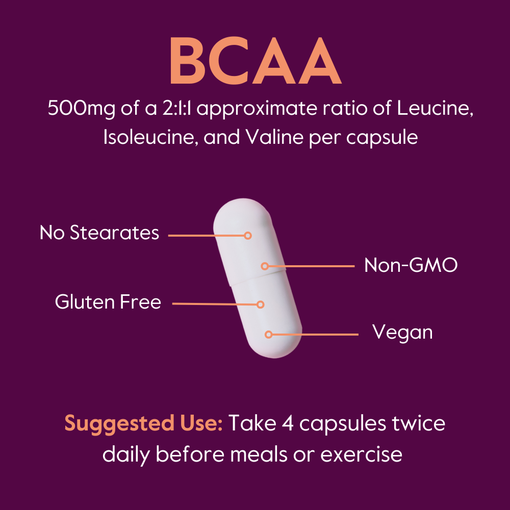 BCAA is comprised of the essential amino acids: L-Leucine, L-Isoleucine and L-Valine. Our formula is offered as a 2:1:1 blend.*