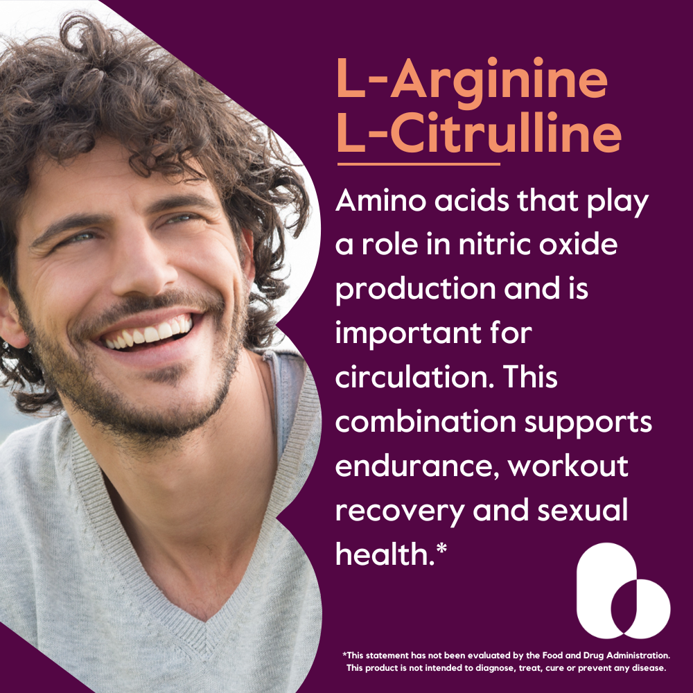 L-Arginine is an amino acid involved in DNA synthesis and protein production. L-Citrulline is a non-essential amino acid and a byproduct of protein metabolism.*