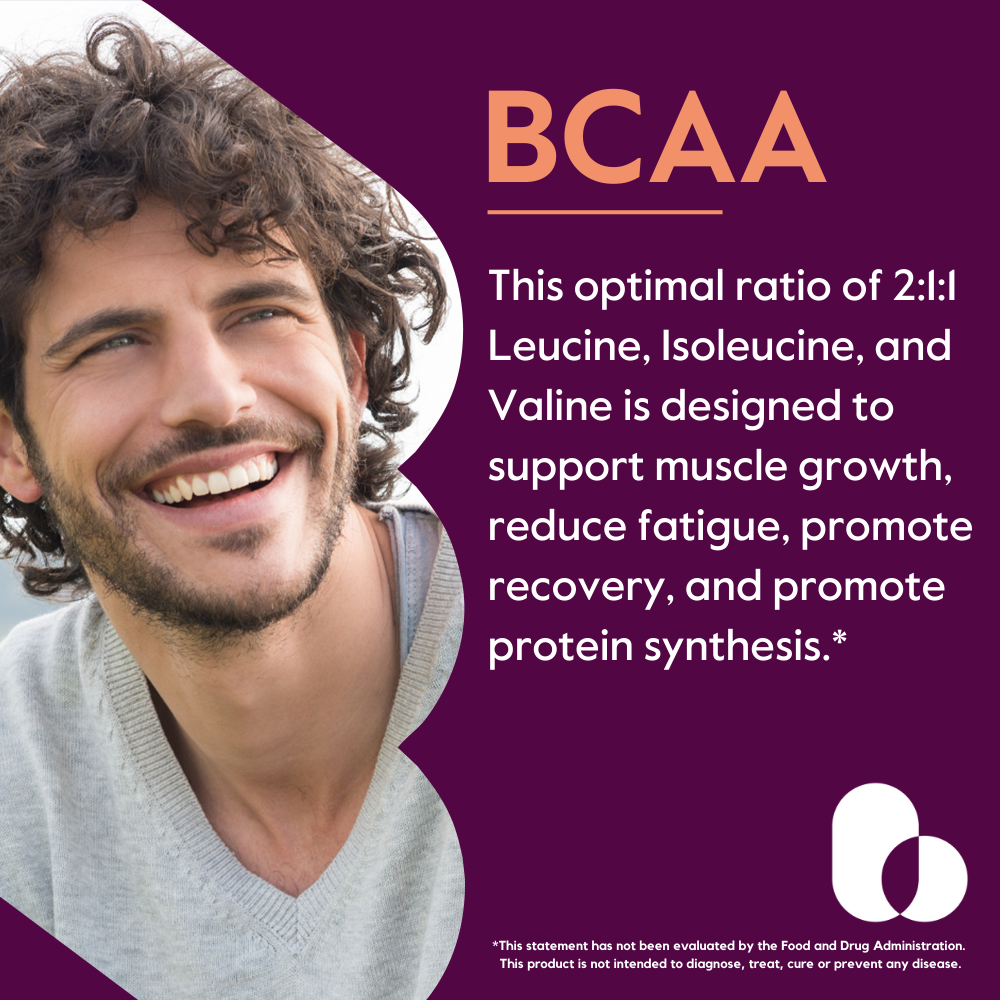 BCAA is comprised of the essential amino acids: L-Leucine, L-Isoleucine and L-Valine. Our formula is offered as a 2:1:1 blend.*