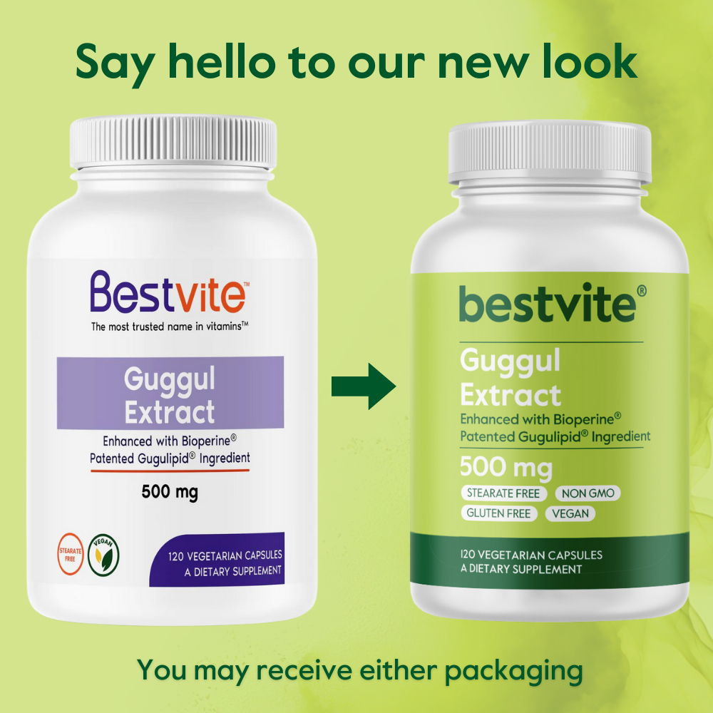 Bestvites Guggul Extract provides a minimum of 2.5% Guggulsterones. Guggulsterones have been shown to help support healthy cholesterol levels in the body and to assist in healthy thyroid function. The clinically studied ingredient is enhanced with Bioperine, a natural Black Pepper Extract, that is believed to enhance the bioavailability of the Guggulsterones.*